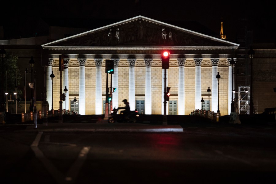 A man rides a motorbike as he passes by the National Assembly during curfew in Paris, Saturday, Oct. 17, 2020. French restaurants, cinemas and theaters are trying to figure out how to survive a new curfew aimed at stemming the flow of record new coronavirus infections. The monthlong curfew came into effect Friday at midnight, and France is deploying 12,000 extra police to enforce it. (AP Photo/Lewis Joly)