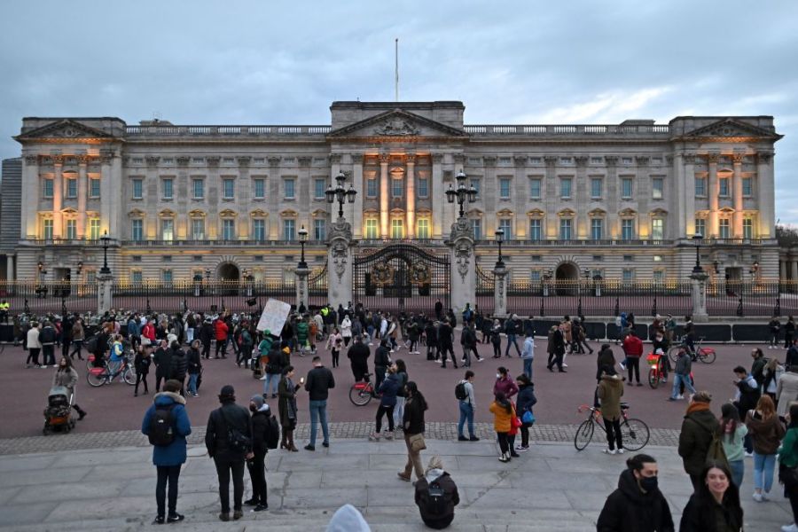 Well-wishers gather outside the gates of Buckingham Palace in central London on April 9, 2021 after the announcement of the death of Britain’s Prince Philip, Duke of Edinburgh. – Prince Philip, the longest serving royal consort in British history who was a constant presence at Queen Elizabeth II’s side for decades, died on Friday aged 99, Buckingham Palace announced. (Photo by JUSTIN TALLIS / AFP) (Photo by JUSTIN TALLIS/AFP via Getty Images)