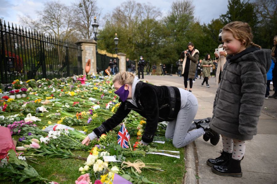 WINDSOR, UNITED KINGDOM – APRIL 09: A woman adds a bunch of flowers to the floral tributes outside Windsor Castle following the death of Prince Philip, on April 09, 2021 in Windsor, United Kingdom. The Queen has announced the death of her beloved husband, His Royal Highness Prince Philip, Duke of Edinburgh. HRH passed away peacefully this morning at Windsor Castle. (Photo by Leon Neal/Getty Images)