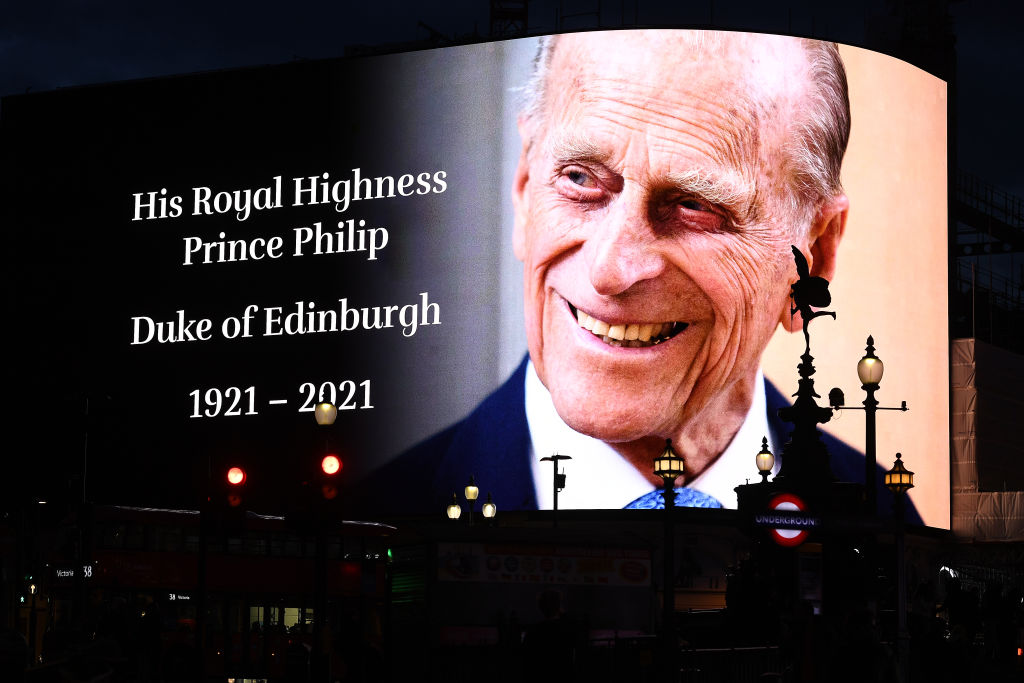LONDON, ENGLAND – APRIL 09: Notice of Prince Philip, Duke of Edinburgh’s death is displayed on the large screen at Piccadilly Circus on April 09, 2021 in London, United Kingdom. The Queen has announced the death of her beloved husband, His Royal Highness Prince Philip, Duke of Edinburgh. HRH passed away peacefully this morning at Windsor Castle. (Photo by Jeff Spicer/Getty Images)
