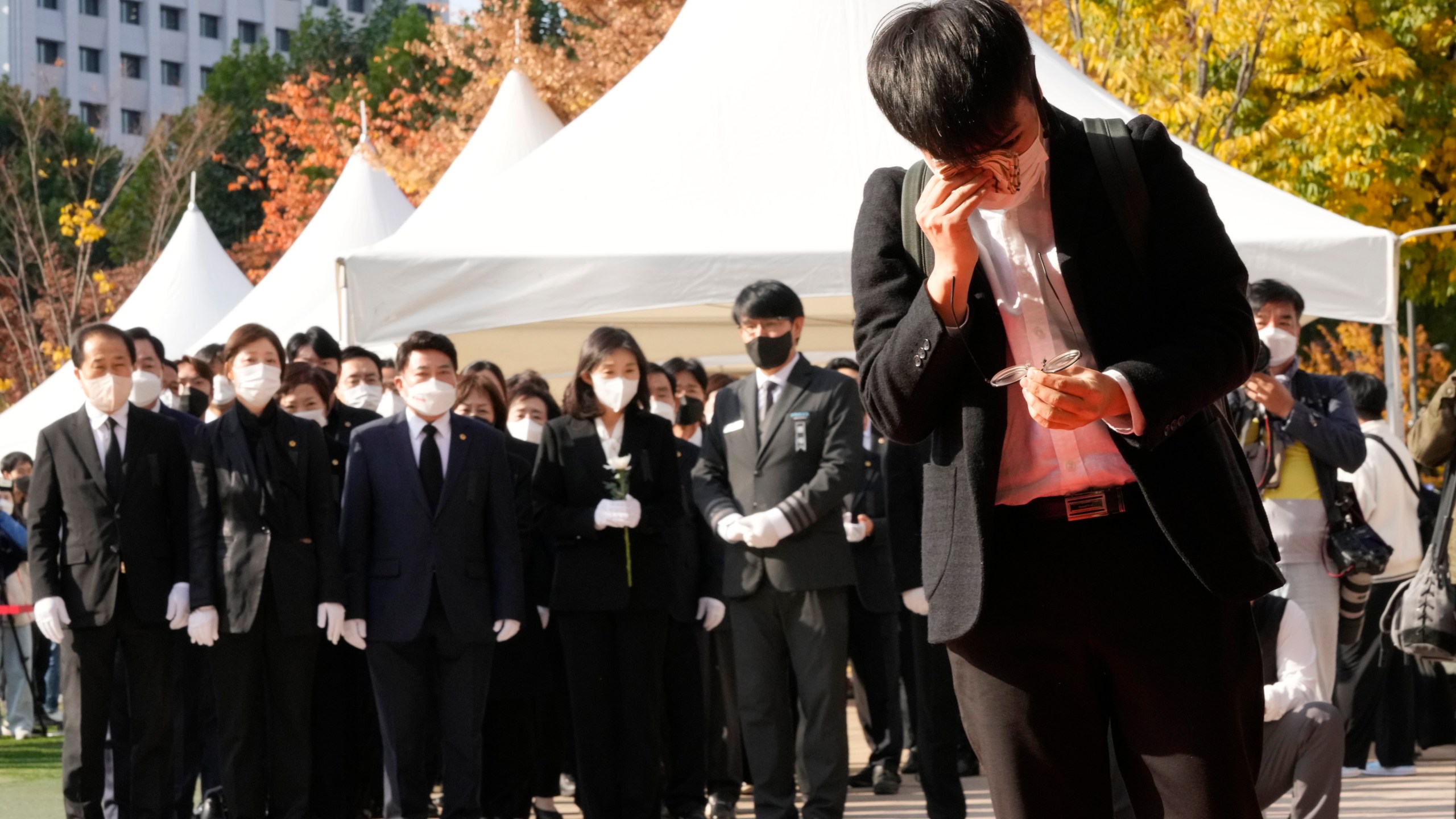 A mourner wipes his tear as he pays a silent tribute for victims of a deadly accident following Saturday night’s Halloween festivities, at a joint memorial altar for victims at Seoul Square in Seoul, South Korea, Monday, Oct. 31, 2022. (AP Photo/Ahn Young-joon)