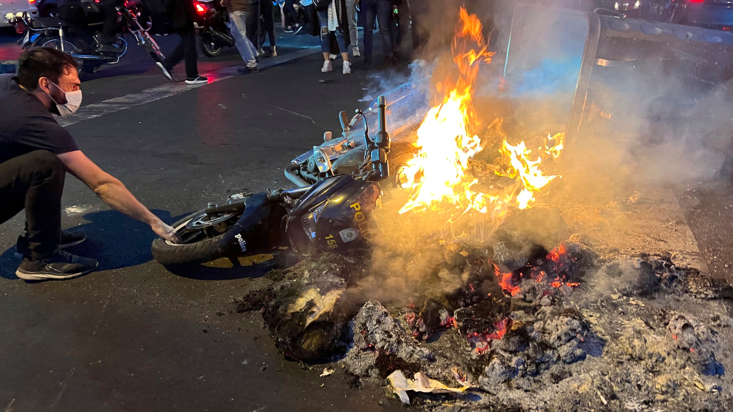 State TV showed footage of protests on Monday, including images of two police cars with their windows smashed. It said the protesters torched two motorbikes as well, and that they burned Iranian flags in Kurdish areas and Tehran.