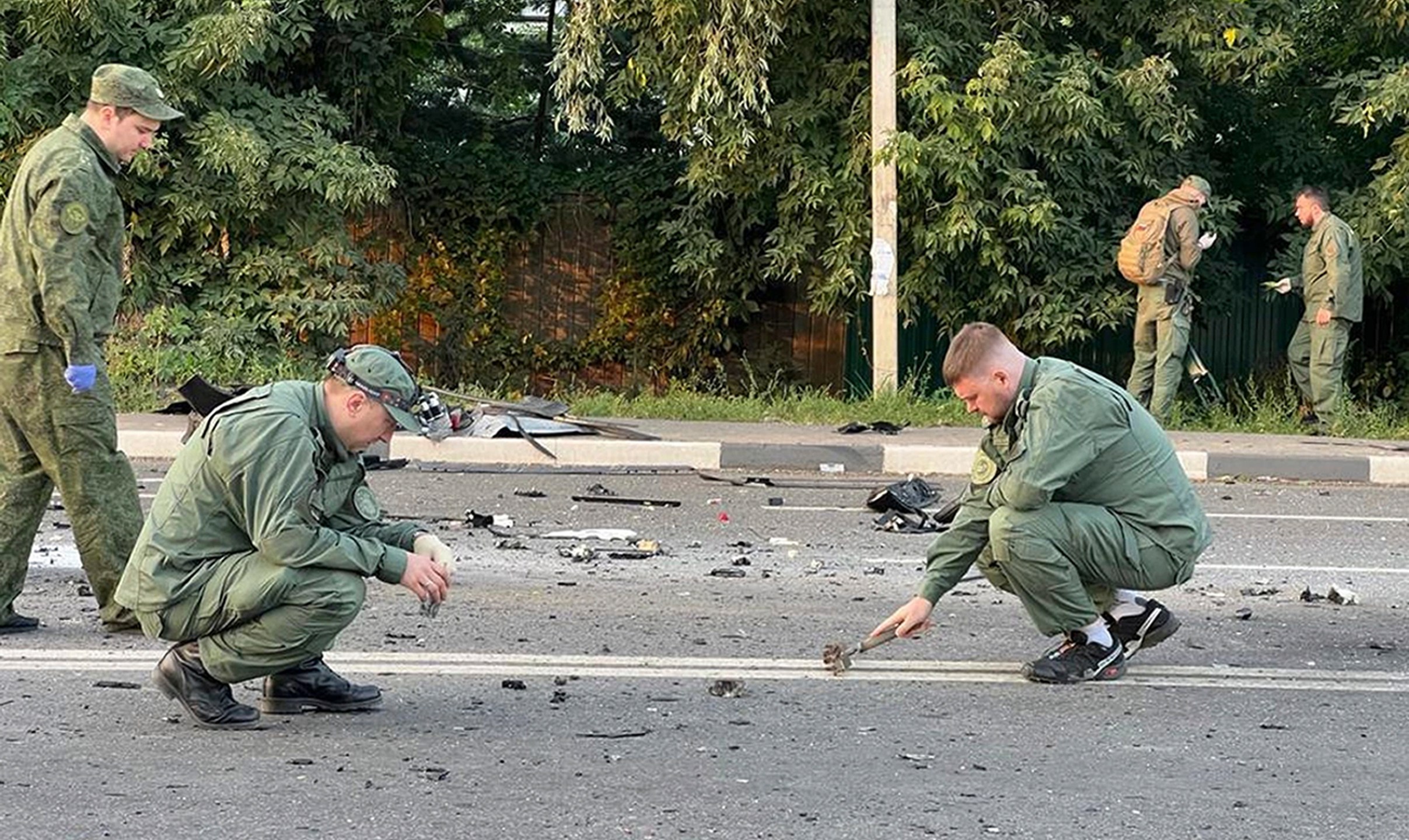 In this handout photo taken from video released by Investigative Committee of Russia on Sunday, Aug. 21, 2022, investigators work on the site of explosion of a car driven by Daria Dugina outside Moscow. Daria Dugina, the daughter of Alexander Dugin, the Russian nationalist ideologist often called “Putin’s brain”, was killed when her car exploded on the outskirts of Moscow, officials said Sunday. The Investigate Committee branch for the Moscow region said the Saturday night blast was caused by a bomb planted in the SUV driven by Daria Dugina.(Investigative Committee of Russia via AP)