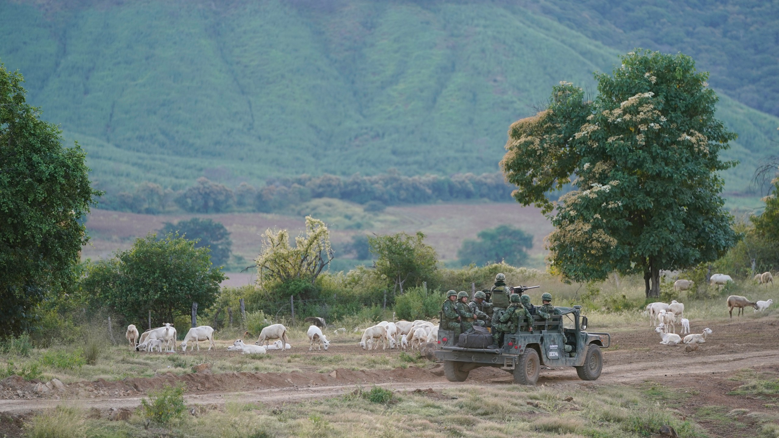 AGUILILLA, Mexico (AP) — In western Mexico a small squad of soldiers with about a half-dozen trucks and sandbag emplacements stands guard on a rural highway. In one direction, almost within earshot, one drug cartel operates a roadblock extorting farmers. In the other direction, a rival cartel carries out armed patrols in trucks bearing its initials.