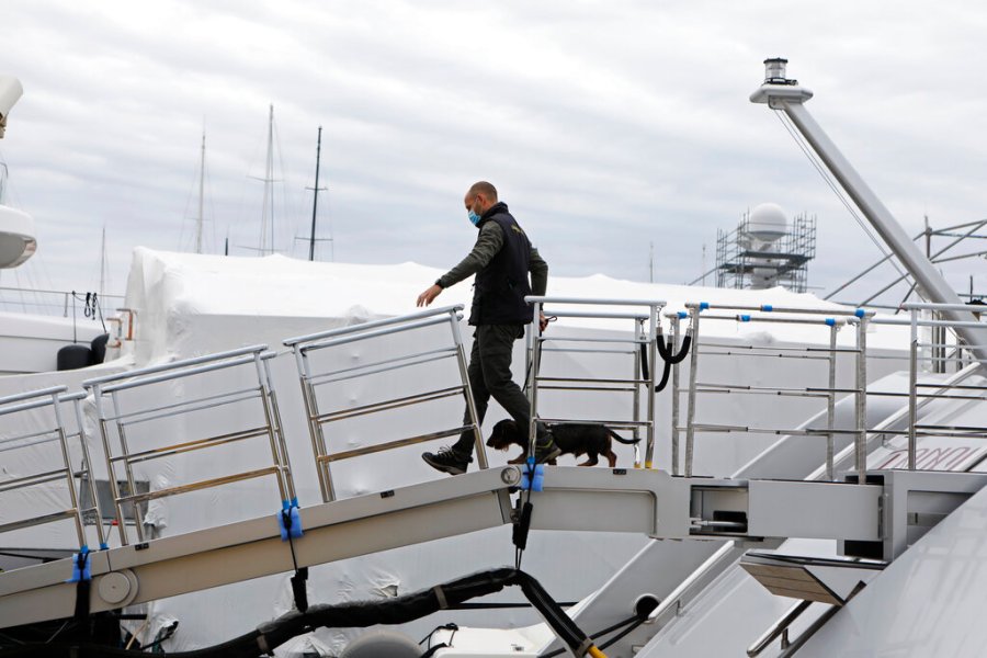 A Civil Guard and a police dog walk off the yacht called Tango in Palma de Mallorca, Spain, Monday April 4, 2022. U.S. federal agents and Spain’s Civil Guard are searching the yacht owned by a Russian oligarch. The yacht is among the assets linked to Viktor Vekselberg, a billionaire and close ally with Russia’s President Vladimir Putin, who heads the Moscow-based Renova Group, a conglomerate encompassing metals, mining, tech and other assets, according to U.S. Treasury Department documents. All of Vekselberg’s assets in the U.S. are frozen and U.S. companies are forbidden from doing business with him and his entities. (AP Photo/Francisco Ubilla)