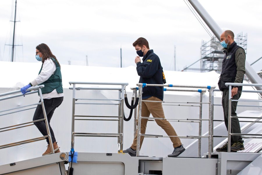 A U.S. federal agent and two Civil Guards board the yacht called Tango in Palma de Mallorca, Spain, Monday April 4, 2022. U.S. federal agents and Spain’s Civil Guard are searching the yacht owned by a Russian oligarch. The yacht is among the assets linked to Viktor Vekselberg, a billionaire and close ally with Russia’s President Vladimir Putin, who heads the Moscow-based Renova Group, a conglomerate encompassing metals, mining, tech and other assets, according to U.S. Treasury Department documents. All of Vekselberg’s assets in the U.S. are frozen and U.S. companies are forbidden from doing business with him and his entities. (AP Photo/Francisco Ubilla)
