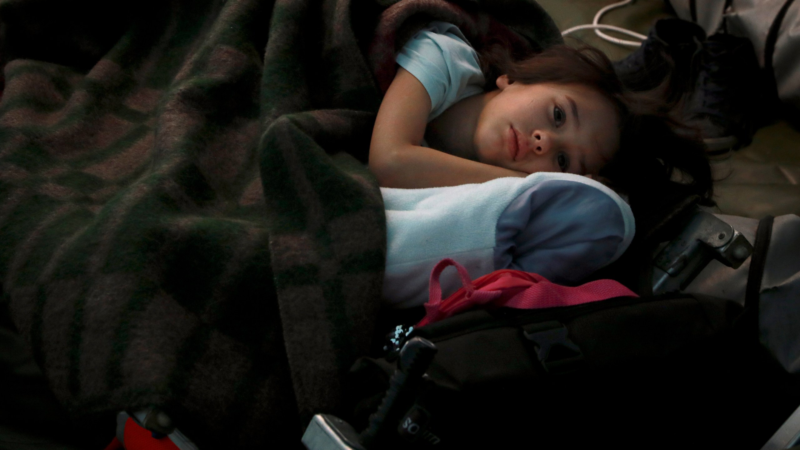 A child from Ukraine sleeps in a tent part of a humanitarian centre for refugees at the Moldovan-Ukrainian border, in Palalanca, Moldova, Friday, Feb. 25, 2022. Thousands of Ukrainians are fleeing from war by crossing their borders to the west in search of safety. They left their country as Russia pounded their capital and other cities with airstrikes for a second day on Friday. Cars were backed up for several kilometers (miles) at some border crossings as authorities in Poland, Slovakia, Hungary, Romania and Moldova mobilized to receive them, offering them shelter, food and legal help. (AP Photo/Aurel Obreja)
