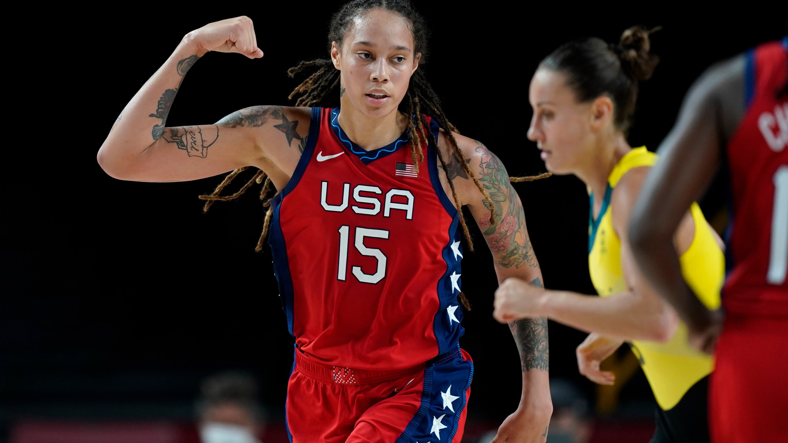 FILE – United States’s Brittney Griner (15) flexes her muscle after making a basket during a women’s basketball quarterfinal round game against Australia at the 2020 Summer Olympics, Wednesday, Aug. 4, 2021, in Saitama, Japan. (AP Photo/Charlie Neibergall, File)