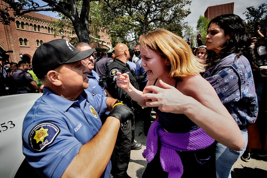 A University of Southern California protester, right, confronts a University Public Safety officer at the campus’ Alumni Park during a pro-Palestinian occupation on Wednesday, April 24, 2024, in Los Angeles. (AP Photo/Richard Vogel)