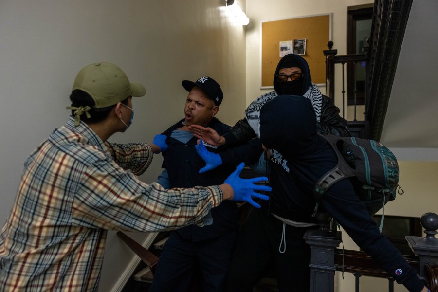 NEW YORK, NEW YORK – APRIL 30: A maintenance crew member confronts demonstrators attempting to barricade themselves inside Hamilton Hall at Columbia University on April 30, 2024 in New York City. Pro-Palestinian demonstrators marched as a 2 p.m. deadline to clear the encampment given to students by the university came and went. The students were given a suspension warning if they did not meet the deadline. Students at Columbia were the first from an elite college to erect an encampment, demanding that the school divest from Israel amid the Israel-Hamas war, in which more than 34,000 Palestinians have been killed in the Gaza Strip. (Photo by Alex Kent/Getty Images)