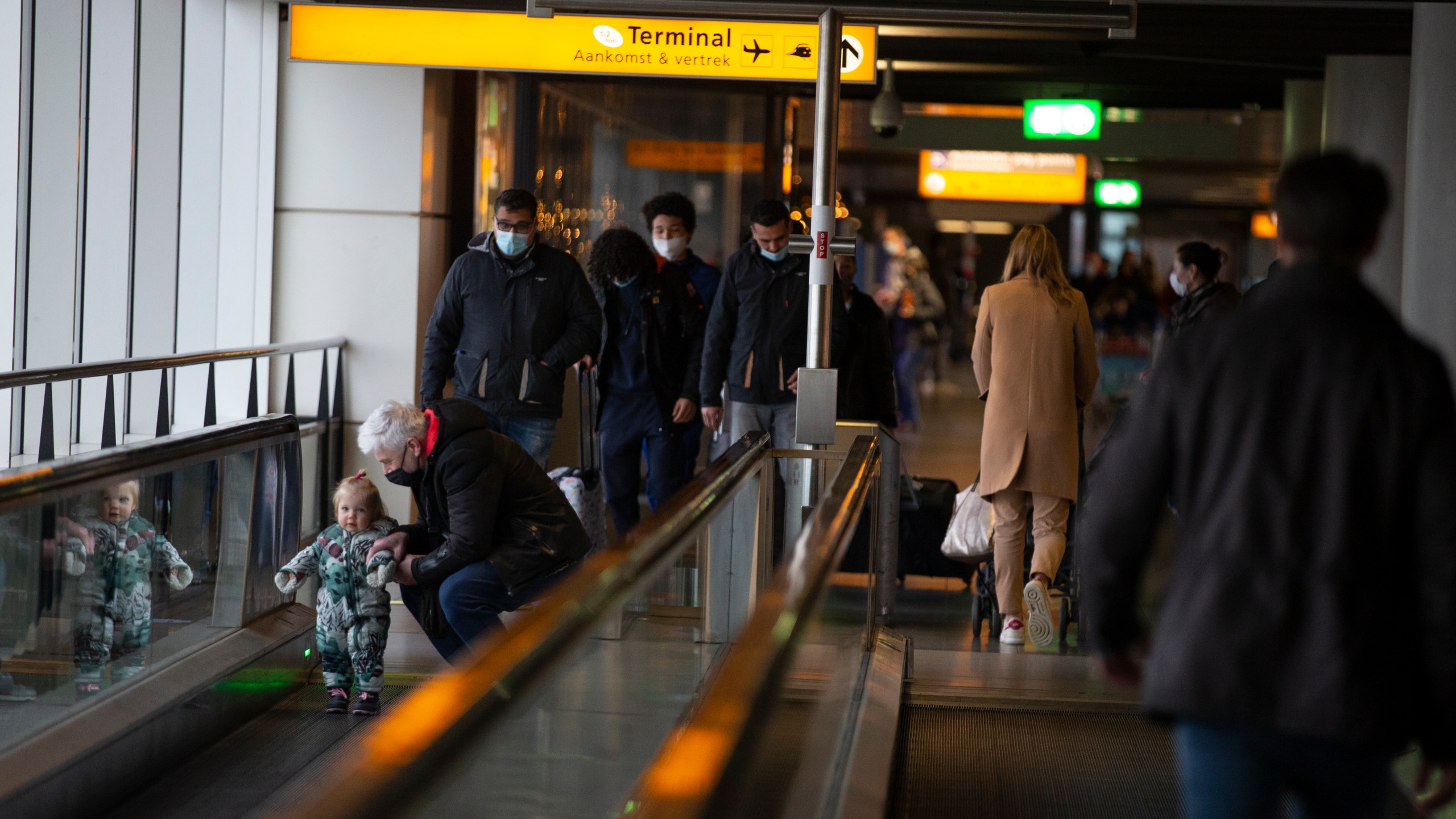 FILE- In this Friday Dec. 18, 2020, file photo, arriving and departing passengers use the flat escalators at Schiphol Airport, near Amsterdam, Netherlands. The Netherlands is banning flights from the United Kingdom for the rest of the year in an attempt to make sure that a new strain of the COVID-19 virus in Britain does not reach its shores. The ban came into effect Sunday morning Dec. 20, 2020, and the government said it was reacting to tougher measures imposed in and around London on Saturday. The Netherlands said it will assess “with other EU nations the possibilities to contain the import of the virus from the United Kingdom.” (AP Photo/Peter Dejong, FILE)