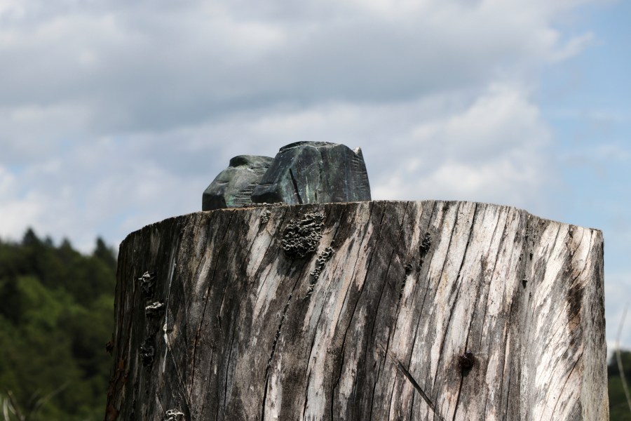 Ankles of sawed off and taken away bronze statue which represented Melania Trump remain on the tree stump where it was placed in 2020, in the village of Rozno, Slovenia, Friday, May 16, 2025, near Melania Trump’s hometown of Sevnica. (AP Photo/Relja Dusek)