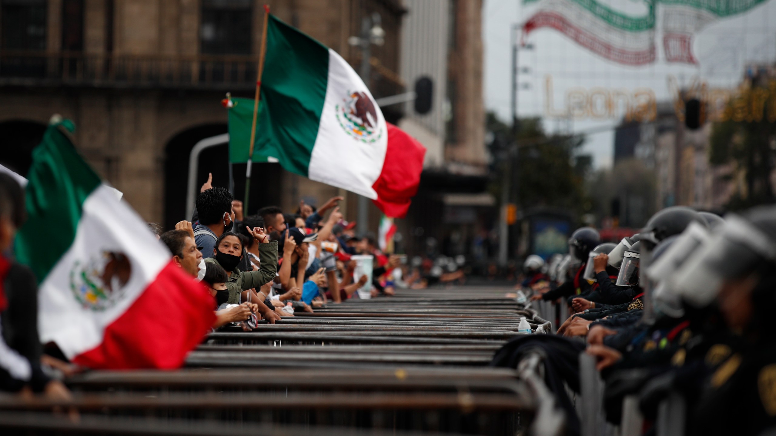 Some participants in a protest marking the sixth anniversary of the forced disappearance of 43 teachers’ college students shout over a barricade and a line of police toward unrelated protesters camping out in Mexico City’s main square to call for the renunciation of the president, Saturday, Sept. 26, 2020. (AP Photo/Rebecca Blackwell)