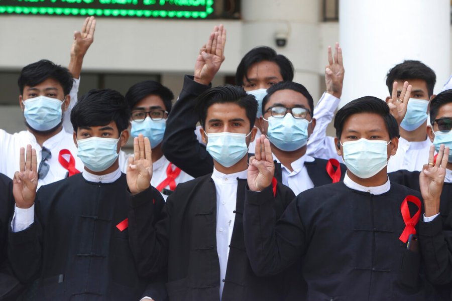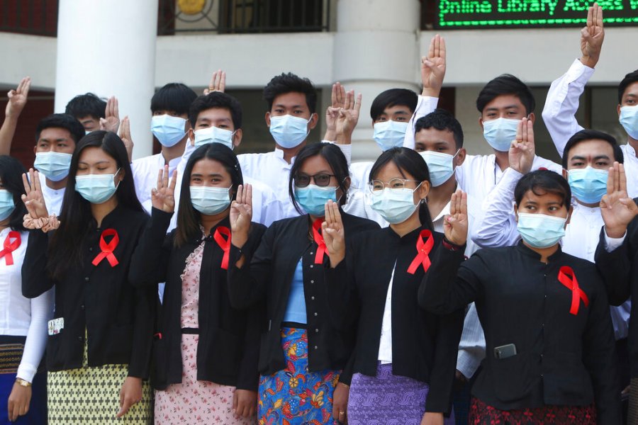 Members of the crowd shouted “Military dictatorship should fall” and “Down with dictatorship.” They marched with their hands in the air, formed into three-fingered salutes, a symbol of defiance adopted from protesters in neighboring Thailand, who borrowed the gesture from the “Hunger Games” movie franchise.