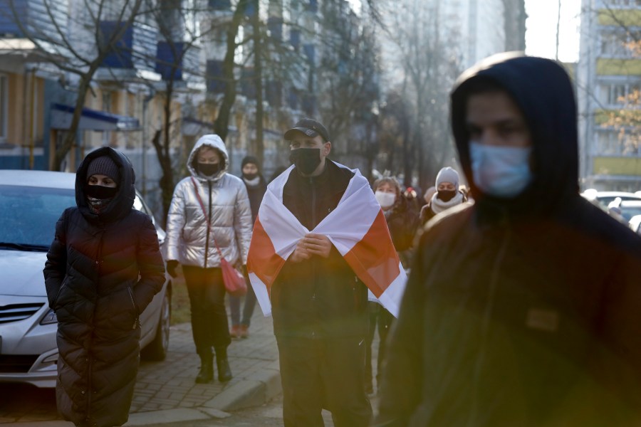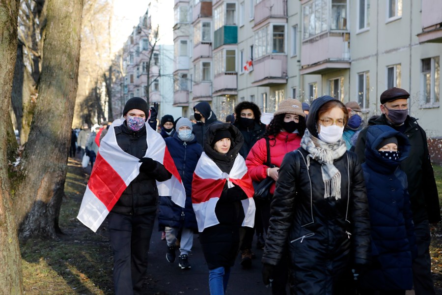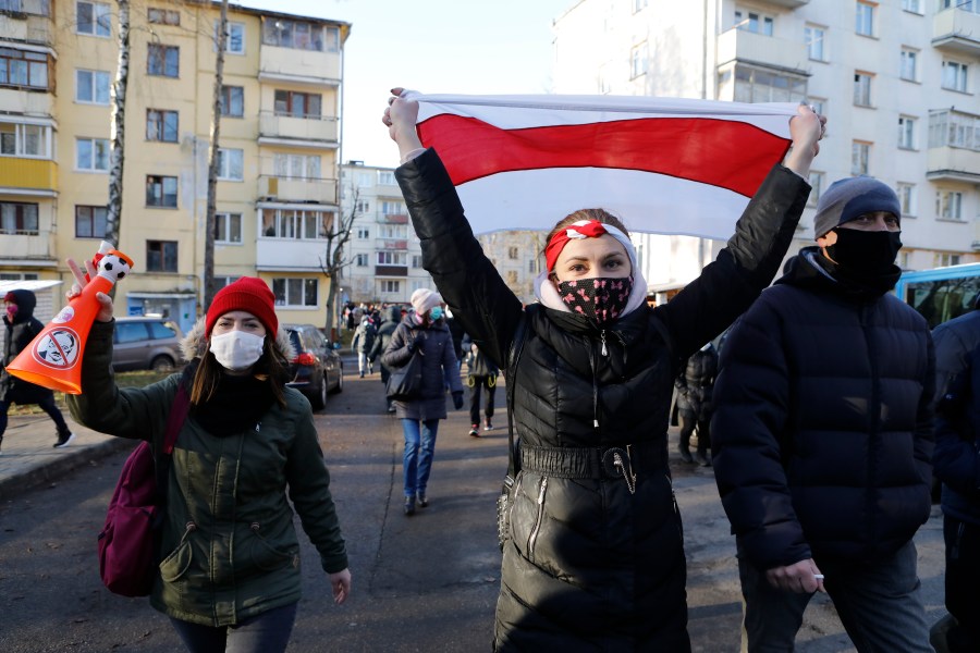 Demonstrators wearing face masks to help curb the spread of the coronavirus, at right one waves an old Belarusian national flag, during an opposition rally to protest the official presidential election results in Minsk, Belarus, Sunday, Dec. 6, 2020. Protests in Belarus have continued for almost four months after President Alexander Lukashenko won his sixth term in office in an election the opposition says was rigged. (AP Photo)