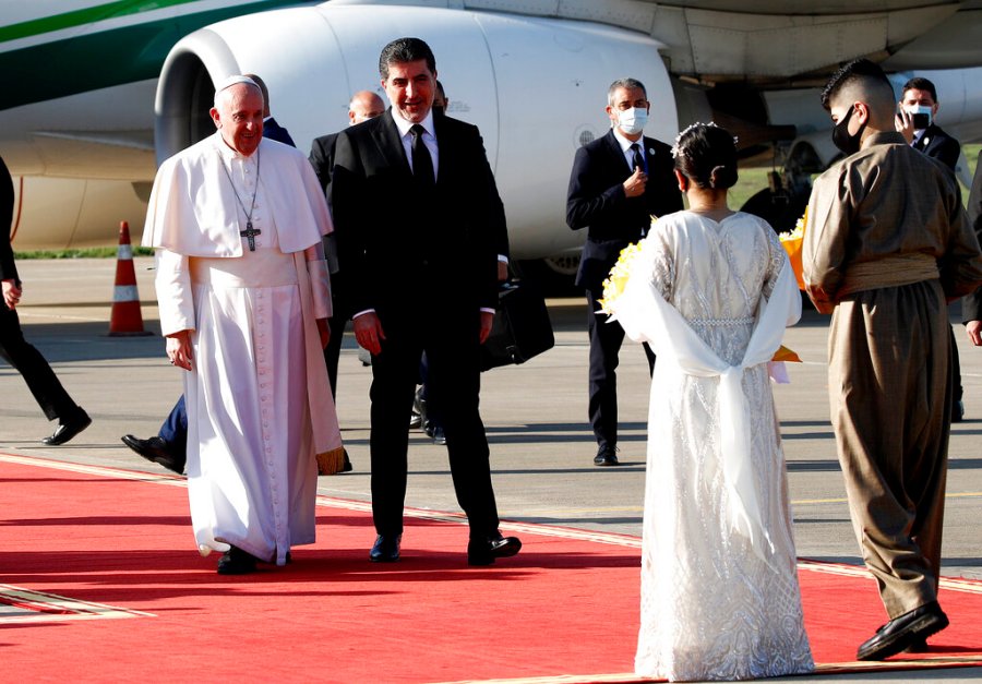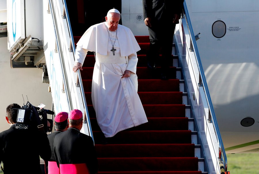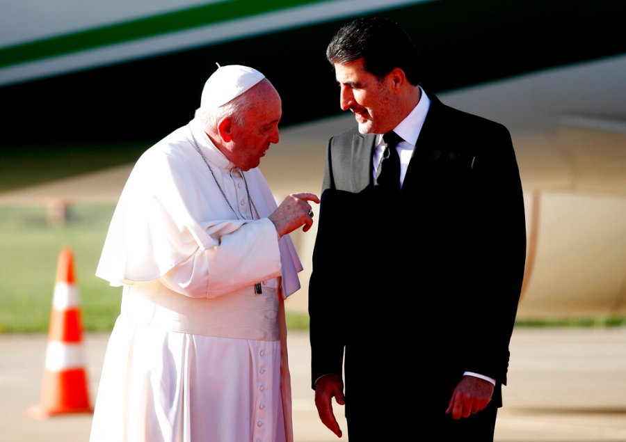 IRBIL, Iraq (AP) — Pope Francis arrived in northern Iraq on Sunday, where he planned to pray in the ruins of churches damaged or destroyed by Islamic State extremists and celebrate an open-air Mass on the last day of the first-ever papal visit to the country.