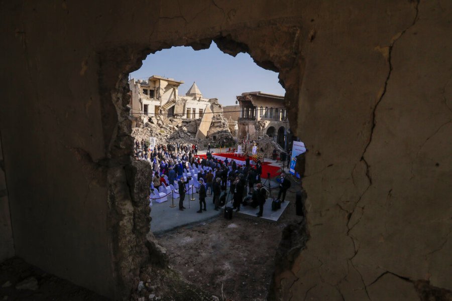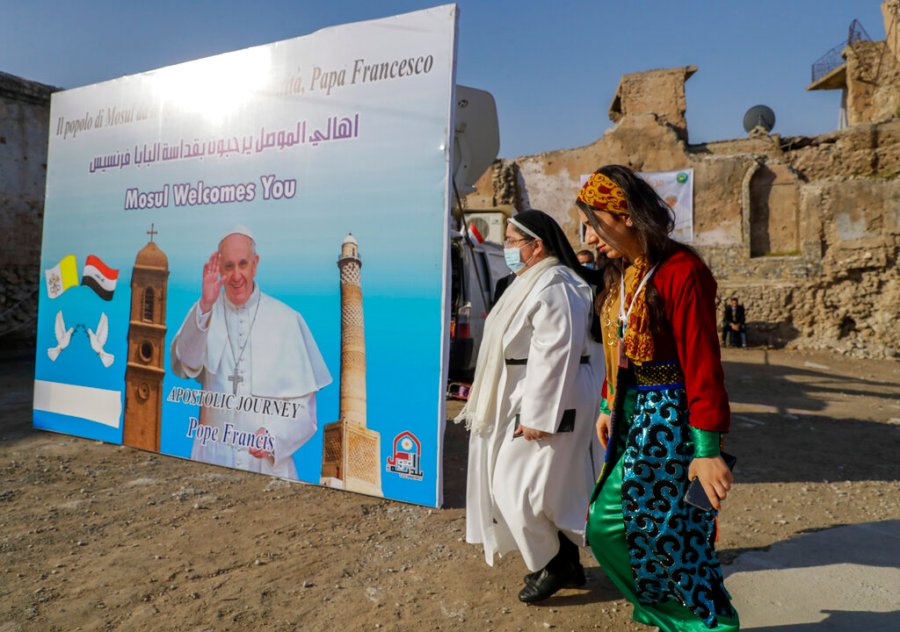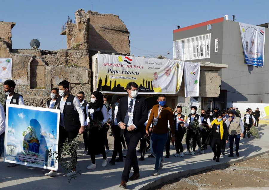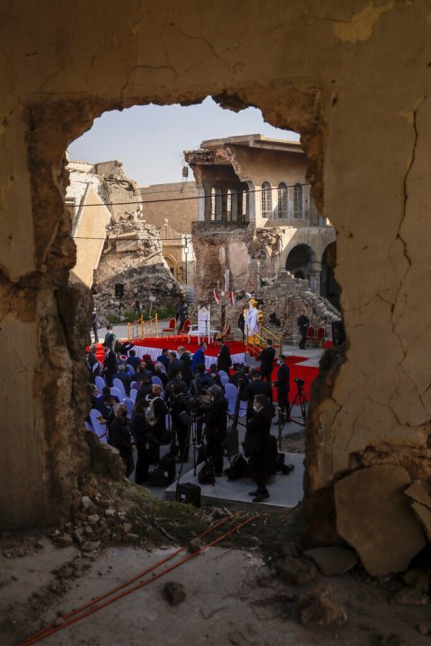 Francis headed to the northern city of Mosul, which was heavily damaged in the war against IS, to pray for Iraq’s war victims. In a scene unimaginable just four years ago, he mounted a stage in a city square surrounded by the remnants of four damaged churches belonging to some of Iraq’s myriad Christian rites and denominations. A jubilant crowd welcomed him.