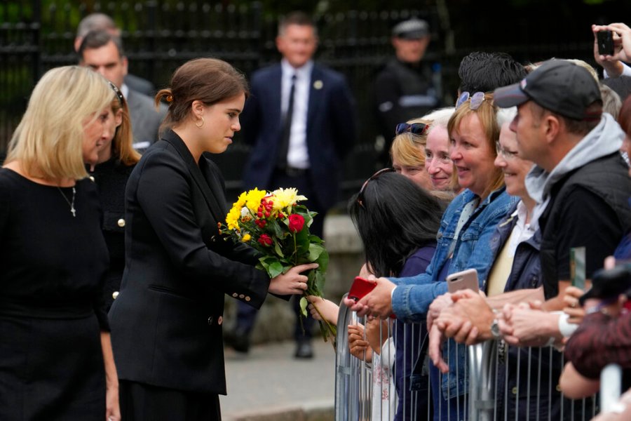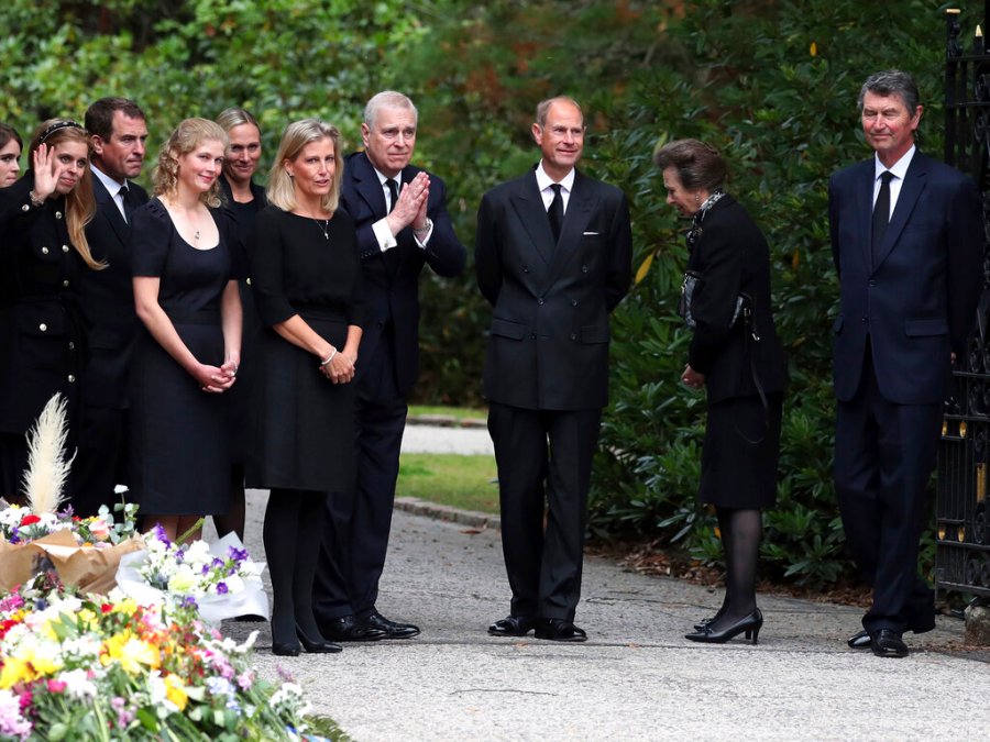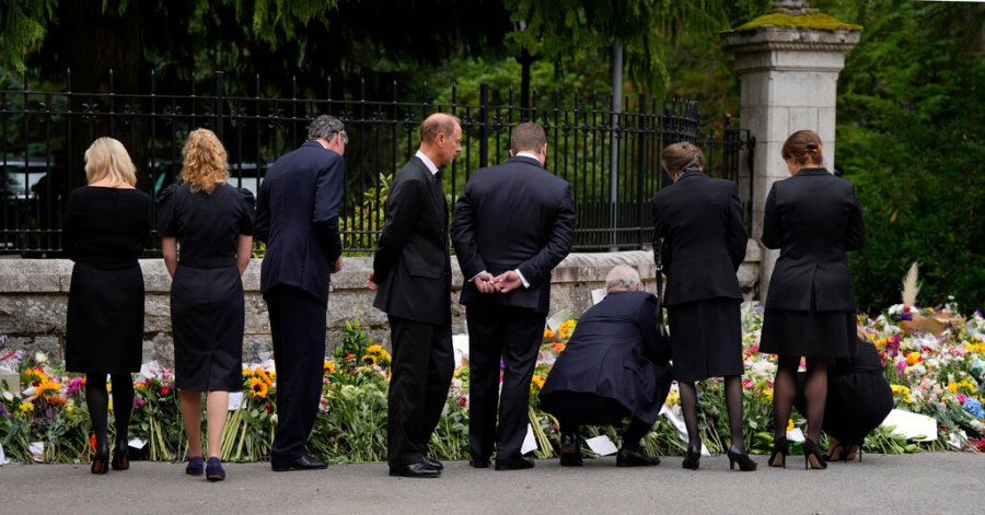 William and his wife, Princess Kate, as well as Prince Harry and his wife Meghan, the Duchess of Sussex, viewed floral tributes left by the public in honor of the Queen. Both princes and their wives studied the bouquets before waving at a crowd of well-wishers outside the gates of Windsor Castle.