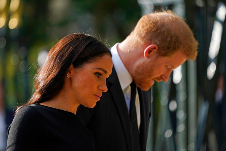 Britain’s Prince William and Kate, Princess of Wales, left, and Britain’s Prince Harry and Meghan, Duchess of Sussex walk to greet the crowds after viewing the floral tributes for the late Queen Elizabeth II outside Windsor Castle, in Windsor, England, Saturday, Sept. 10, 2022. (AP Photo/Alberto Pezzali)