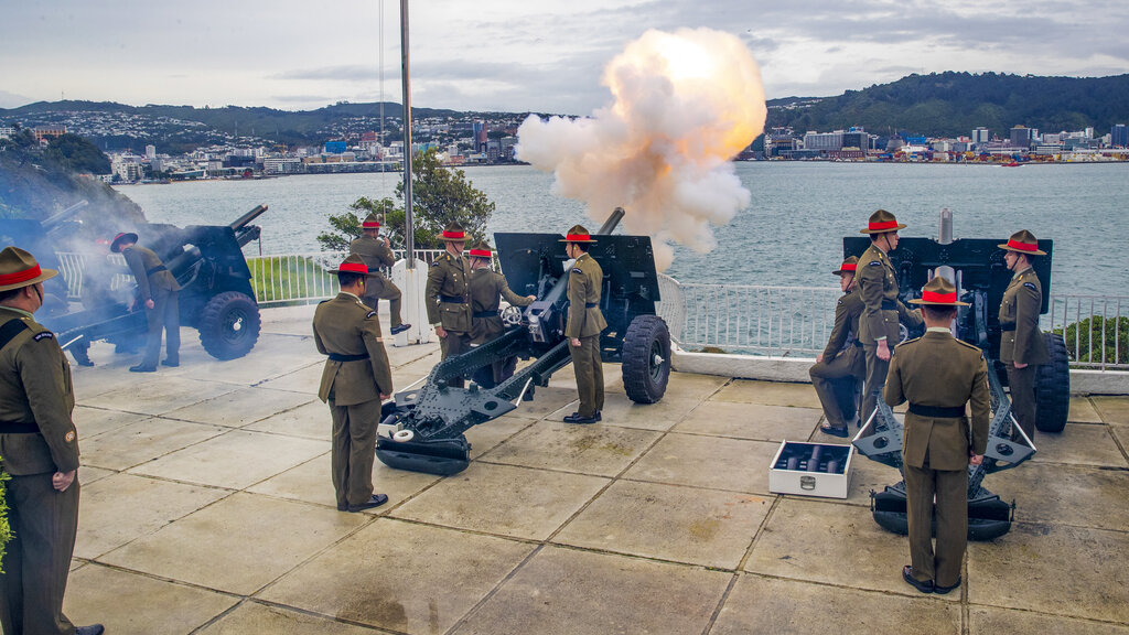 The Royal Regiment of New Zealand Artillery, using four 25-pounder guns, react during their 21-gun salute at Point Jerningham, to mark the 70th anniversary of the coronation of the Queen, Elizabeth II, in Wellington, New Zealand, Thursday, June 2, 2022. (Mark Mitchell/NZME via AP)