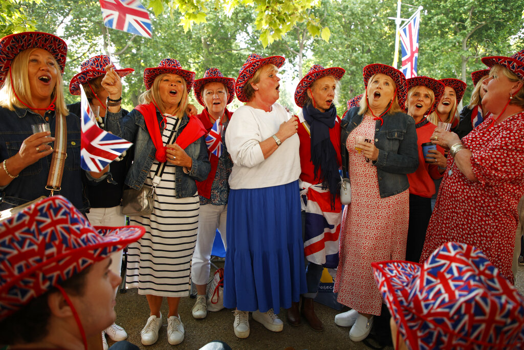 Royal fans sing the national anthem as they gather along the Mall leading to Buckingham Palace in London, Thursday June 2, 2022, on the first of four days of celebrations to mark the Platinum Jubilee. The events over a long holiday weekend in the U.K. are meant to celebrate the monarch’s 70 years of service. (AP Photo/David Cliff)