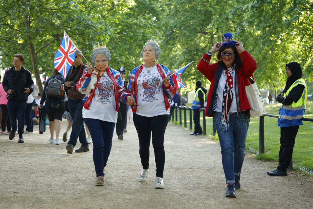 Royal fans walk alongside the Mall leading to Buckingham Palace in London, Thursday June 2, 2022, on the first of four days of celebrations to mark the Platinum Jubilee. The events over a long holiday weekend in the U.K. are meant to celebrate the monarch’s 70 years of service. (AP Photo/David Cliff)
