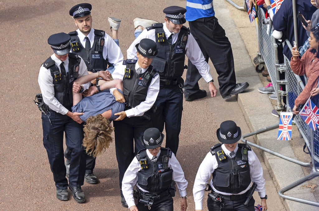 Police officers remove people who ran into the path of the royal procession on The Mall, London, Thursday, June 2, 2022 ahead of the Trooping the Color ceremony, on the first of four days of celebrations to mark the Platinum Jubilee. The events over a long holiday weekend in the U.K. are meant to celebrate the monarch’s 70 years of service. (Dominic Lipinski/PA via AP)