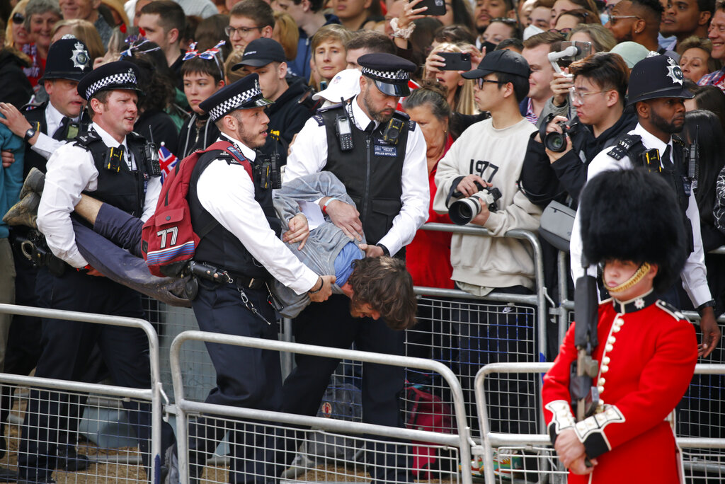 Police officers remove a man who ran into the path of the royal procession on The Mall, London, ahead of the Trooping the Color ceremony in London, Thursday June 2, 2022, on the first of four days of celebrations to mark the Platinum Jubilee. The events over a long holiday weekend in the U.K. are meant to celebrate the monarch’s 70 years of service. (AP Photo/David Cliff)