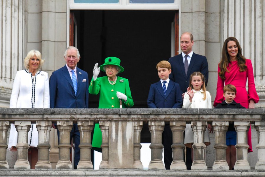 From left, Camilla, Duchess of Cornwall Prince Charles, Queen Elizabeth II, Prince George, Prince William, Princess Charlotte, Prince Louis and Kate, Duchess of Cambridge stand on the balcony, at the end of the Platinum Jubilee Pageant held outside Buckingham Palace, in London, Sunday June 5, 2022, on the last of four days of celebrations to mark the Platinum Jubilee. The pageant will be a carnival procession up The Mall featuring giant puppets and celebrities that will depict key moments from Queen Elizabeth II’s seven decades on the throne. (Roland Hoskins/Pool Photo via AP)