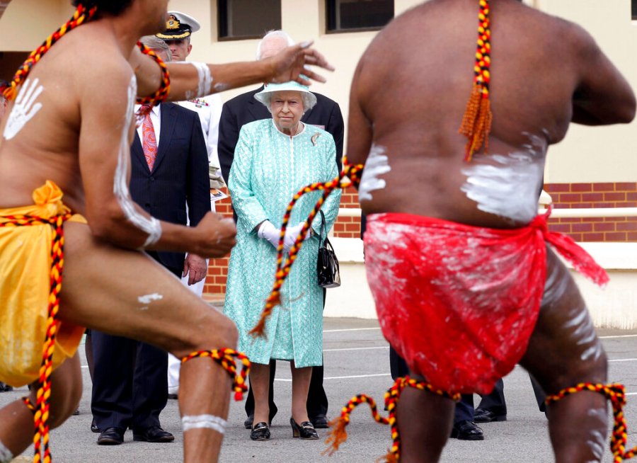 FILE – In this Thursday, Oct. 27, 2011 file photo, Britain’s Queen Elizabeth II, center, watches Aboriginal dancers at Clontarf Aboriginal College in Perth, Australia. Queen Elizabeth II, Britain’s longest-reigning monarch and a rock of stability across much of a turbulent century, has died. She was 96. Buckingham Palace made the announcement in a statement on Thursday Sept. 8, 2022. (Sharon Smith, Pool Photo via AP, File)
