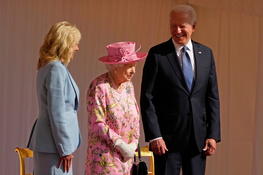 FILE – In this June 13, 2021 file photo US President Joe Biden and First Lady Jill Biden smile while standing with Britain’s Queen Elizabeth II watching a Guard of Honour march past before their meeting at Windsor Castle near London. Queen Elizabeth II, Britain’s longest-reigning monarch and a rock of stability across much of a turbulent century, has died. She was 96. Buckingham Palace made the announcement in a statement on Thursday Sept. 8, 2022. (AP Photo/Matt Dunham, Pool, File)