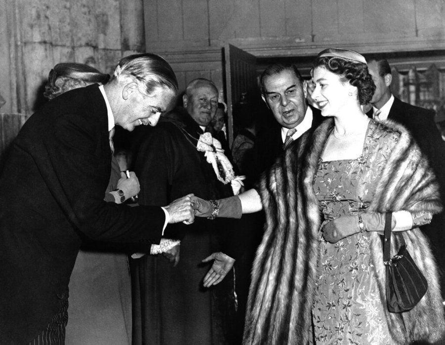 FILE – Britain’s Prime Minister Anthony Eden, left, fresh from his victory over the Labor Party opposition in the British “frogman” incident, smiles and bows as he welcomes Queen Elizabeth II on her arrival at London’s Guildhall on May 15, 1956. In seven decades on the throne, Queen Elizabeth II saw 15 British prime ministers come and go, from Winston Churchill to Margaret Thatcher to Boris Johnson to Liz Truss. (AP Photo, File)