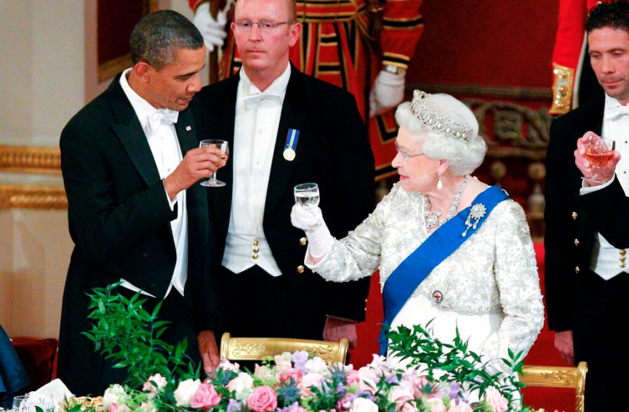 FILE – Queen Elizabeth II, and U.S. President Barack Obama attend a state banquet in Buckingham Palace, London, May 24, 2011. Queen Elizabeth II, Britain’s longest-reigning monarch and a rock of stability across much of a turbulent century, died Thursday, Sept. 8, 2022, after 70 years on the throne. She was 96. (AP Photo/Lewis Whyld, Pool, File)