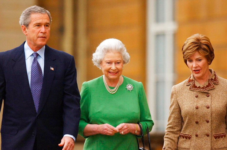 FILE – President George W. Bush, left, and first lady Laura Bush right, walk with Britain’s Queen Elizabeth II, as they leave Buckingham Palace in London, Nov. 21, 2003. Queen Elizabeth II, Britain’s longest-reigning monarch and a rock of stability across much of a turbulent century, died Thursday, Sept. 8, 2022, after 70 years on the throne. She was 96. (Kirsty Wigglesworth/Pool Photo via AP, File)