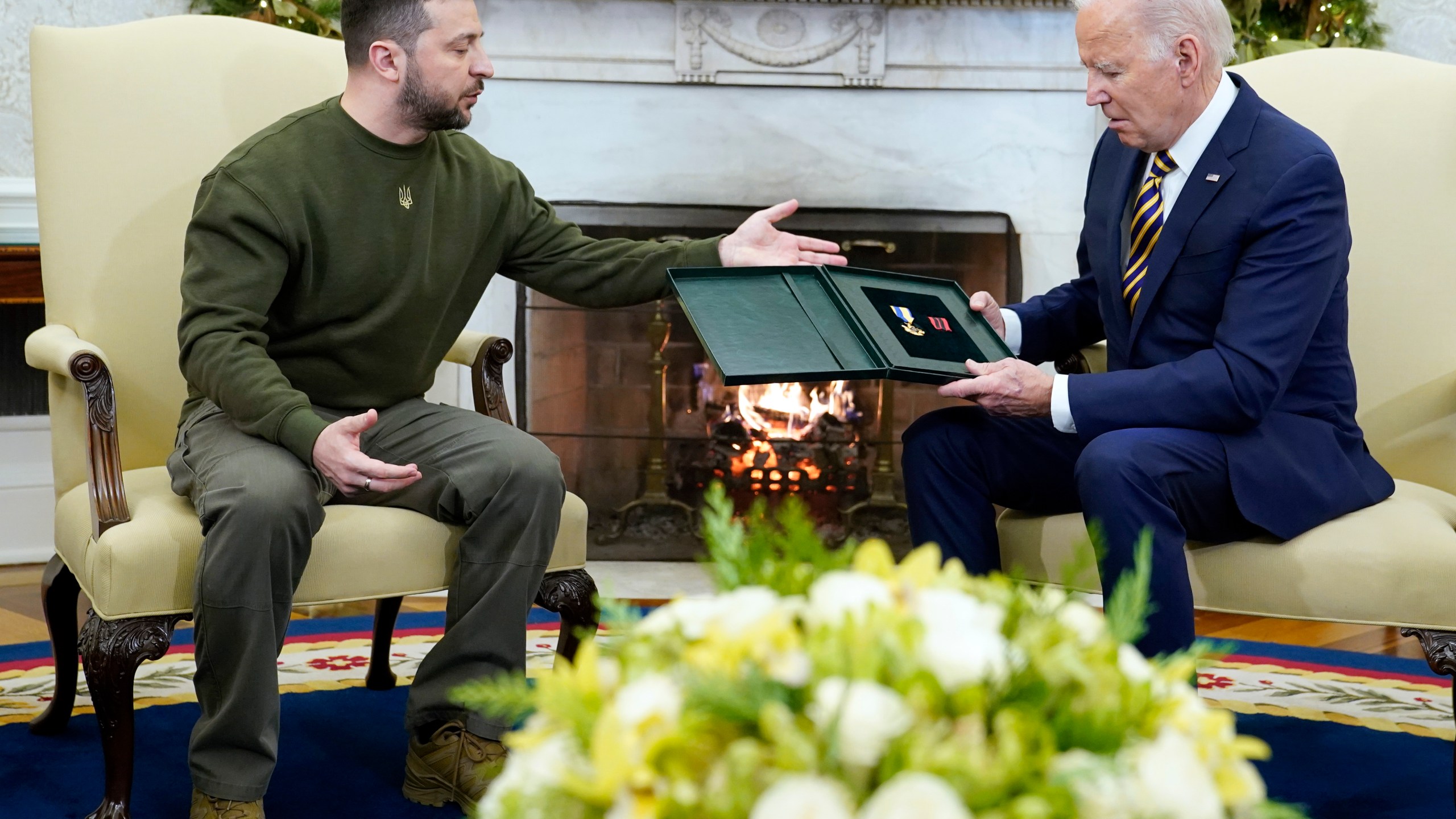 (NewsNation) — Ukrainian President Volodymyr Zelenskyy on Wednesday gave U.S. President Joe Biden a medal while visiting the White House for his first known trip outside Ukraine since Russia invaded in February.