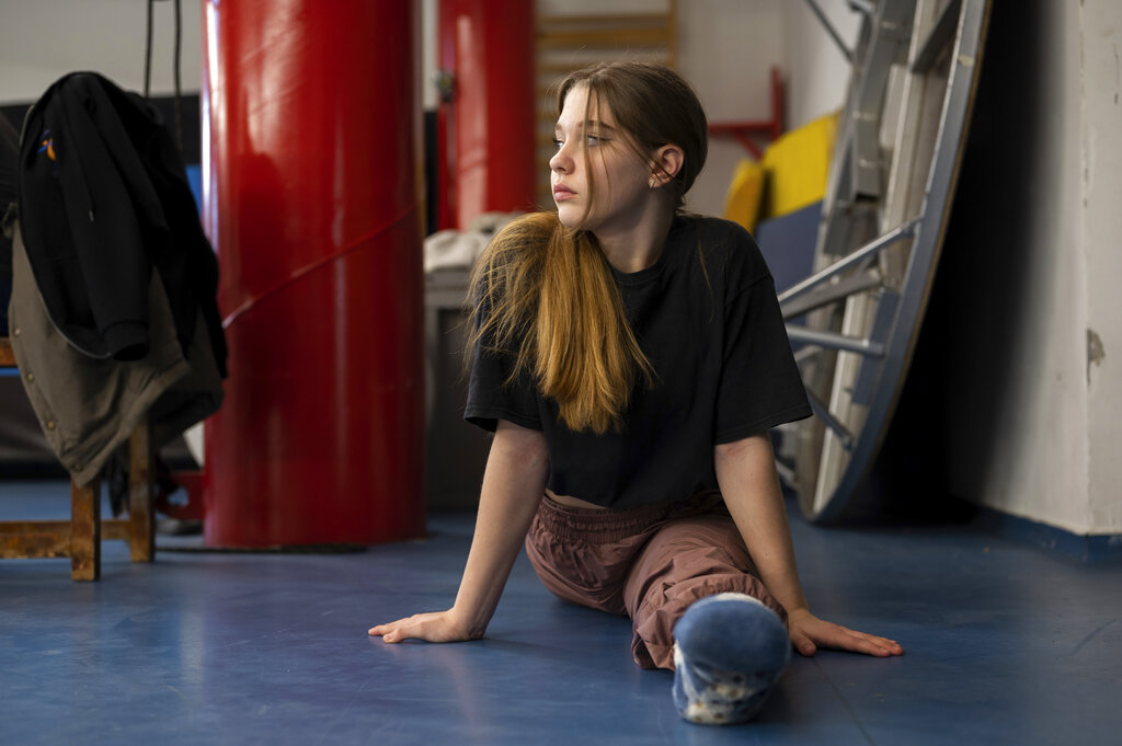 Ukrainian refugee circus student Mariia Lysytska stretching in a training room in Budapest, Hungary, Monday, Feb. 13, 2023. More than 100 Ukrainian refugee circus students, between the ages of 5 and 20, found a home with the Capital Circus of Budapest after escaping the embattled cities of Kharkiv and Kyiv amid Russian bombings. (AP Photo/Denes Erdos)