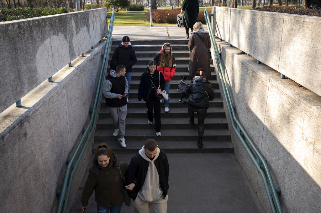 A group of young Ukrainian refugee circus students walking towards their training facility in Budapest, Hungary, Monday, Feb. 13, 2023. More than 100 Ukrainian refugee circus students, between the ages of 5 and 20, found a home with the Capital Circus of Budapest after escaping the embattled cities of Kharkiv and Kyiv amid Russian bombings. (AP Photo/Denes Erdos)
