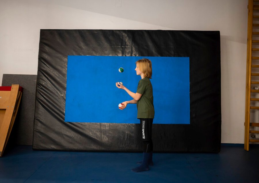 A Ukrainian refugee circus student practicing juggling in a training room in Budapest, Hungary, Monday, Feb. 13, 2023. More than 100 Ukrainian refugee circus students, between the ages of 5 and 20, found a home with the Capital Circus of Budapest after escaping the embattled cities of Kharkiv and Kyiv amid Russian bombings. (AP Photo/Denes Erdos)