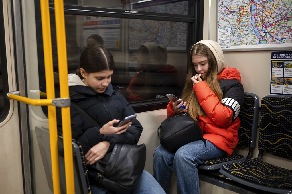 Ukrainian refugee circus student twins Anna and Mariia Lysytska travel together on a subway to their training facility in Budapest, Hungary, Monday, Feb. 13, 2023. More than 100 Ukrainian refugee circus students, between the ages of 5 and 20, found a home with the Capital Circus of Budapest after escaping the embattled cities of Kharkiv and Kyiv amid Russian bombings. (AP Photo/Denes Erdos)
