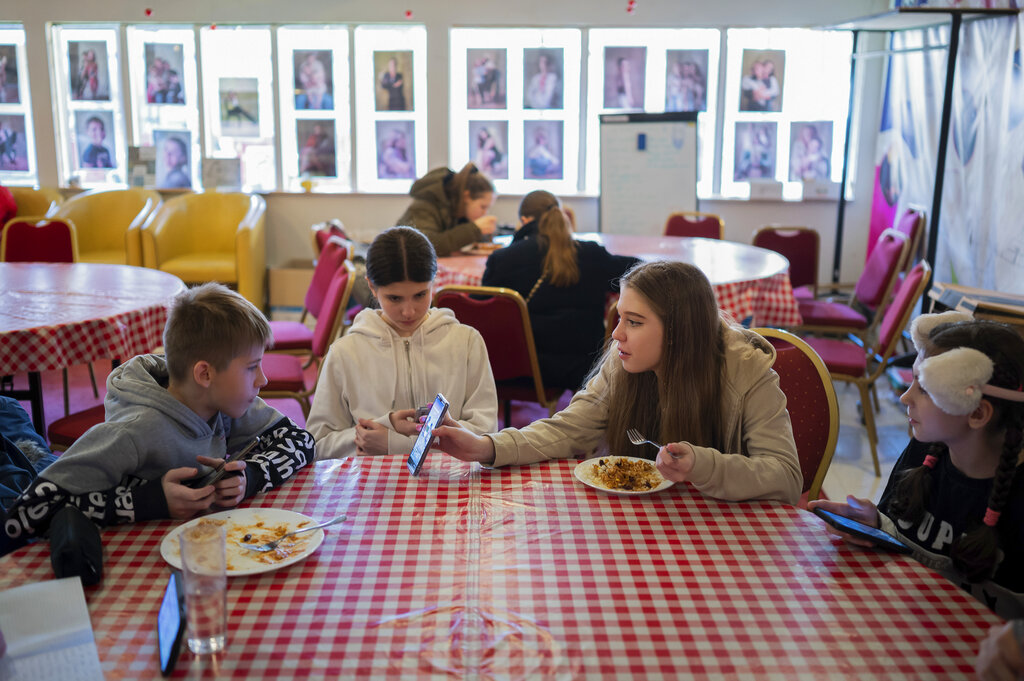 A group of young Ukrainian refugee circus students eating together before the start of their training in Budapest, Hungary, Monday, Feb. 13, 2023. More than 100 Ukrainian refugee circus students, between the ages of 5 and 20, found a home with the Capital Circus of Budapest after escaping the embattled cities of Kharkiv and Kyiv amid Russian bombings. (AP Photo/Denes Erdos)