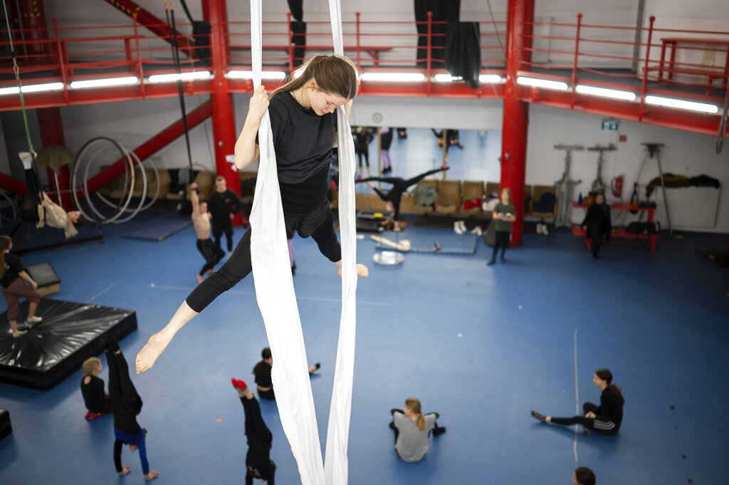 Ukrainian refugee circus student Anna Lysytska practicing in a training room in Budapest, Hungary, Monday, Feb. 13, 2023. More than 100 Ukrainian refugee circus students, between the ages of 5 and 20, found a home with the Capital Circus of Budapest after escaping the embattled cities of Kharkiv and Kyiv amid Russian bombings. (AP Photo/Denes Erdos)