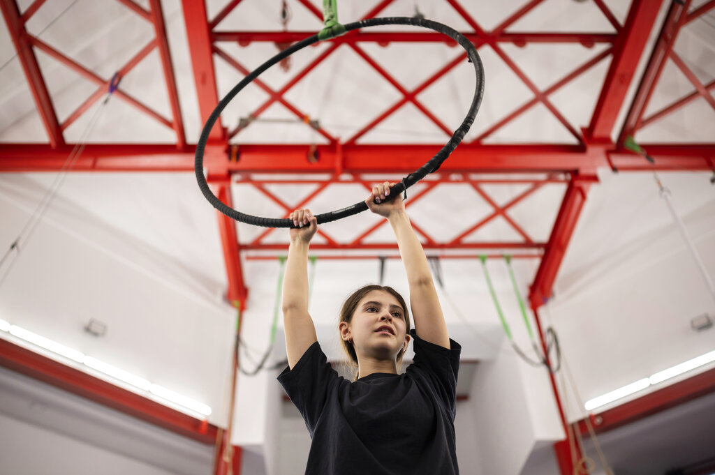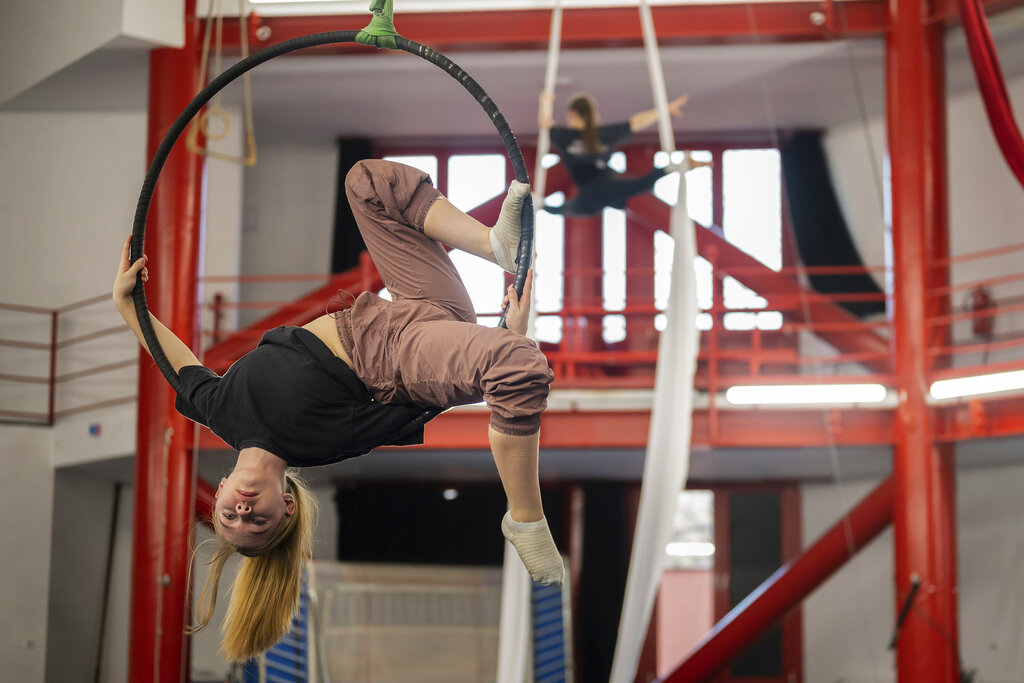 Ukrainian refugee circus student Mariia Lysytska practicing in a training room in Budapest, Hungary, Monday, Feb. 13, 2023. More than 100 Ukrainian refugee circus students, between the ages of 5 and 20, found a home with the Capital Circus of Budapest after escaping the embattled cities of Kharkiv and Kyiv amid Russian bombings. (AP Photo/Denes Erdos)