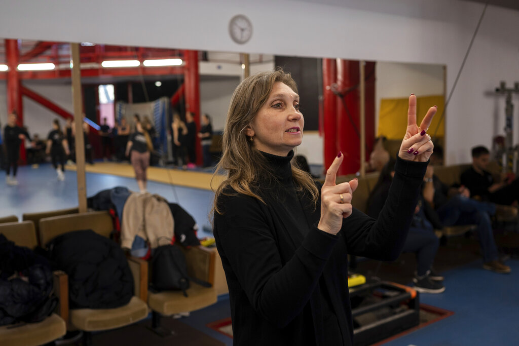 Ukrainian refugee circus trainer Svetlana Momot giving instructions to her students in a training room in Budapest, Hungary, Monday, Feb. 13, 2023. More than 100 Ukrainian refugee circus students, between the ages of 5 and 20, found a home with the Capital Circus of Budapest after escaping the embattled cities of Kharkiv and Kyiv amid Russian bombings. (AP Photo/Denes Erdos)