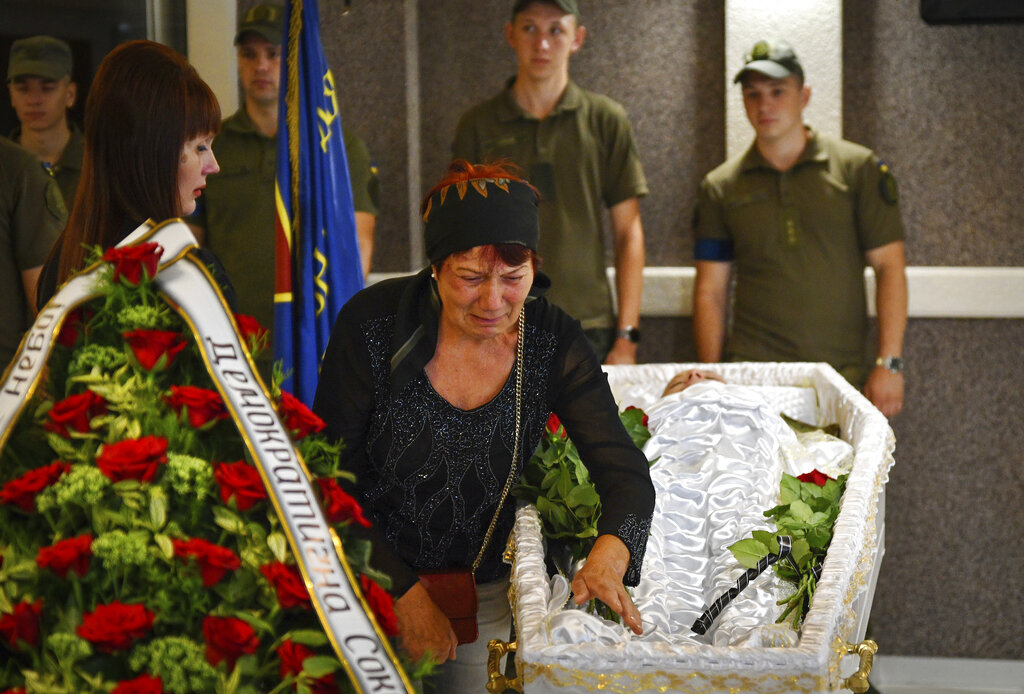 Lyudmila Kolesnik, center, the mother of activist Julia Chaika, mourns over her coffin during a funeral service in Zaporizhzhia, Ukraine, Sunday, Aug. 21, 2022. Julia Chaika was killed fighting Russian forces on Aug. 18. (AP Photo/Andriy Andriyenko)