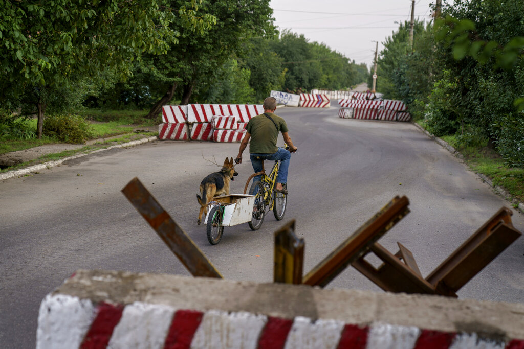 A bicyclist pedals with a dog through a street lined with barricades in Druzhkivka, Donetsk region, eastern Ukraine, Sunday, Aug. 21, 2022. (AP Photo/David Goldman)
