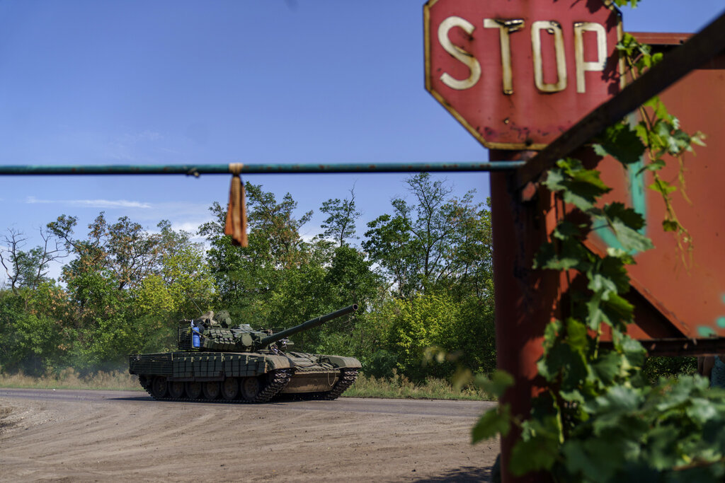 A Ukrainian military tank drives down the road in the Donetsk region, eastern Ukraine, Sunday, Aug. 21, 2022. (AP Photo/David Goldman)