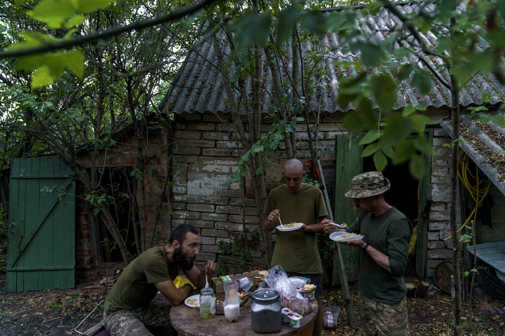 Ukrainian servicemen eat dinner in the village where they’re currently staying in Donetsk region, eastern Ukraine, Sunday, Aug. 21, 2022. (AP Photo/David Goldman)