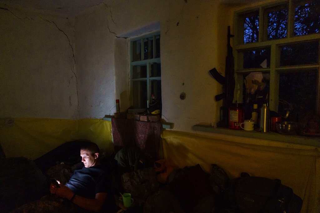 A Ukrainian serviceman looks at his phone on his bed in the village where their unit is currently staying in Donetsk region, eastern Ukraine, Sunday, Aug. 21, 2022. (AP Photo/David Goldman)