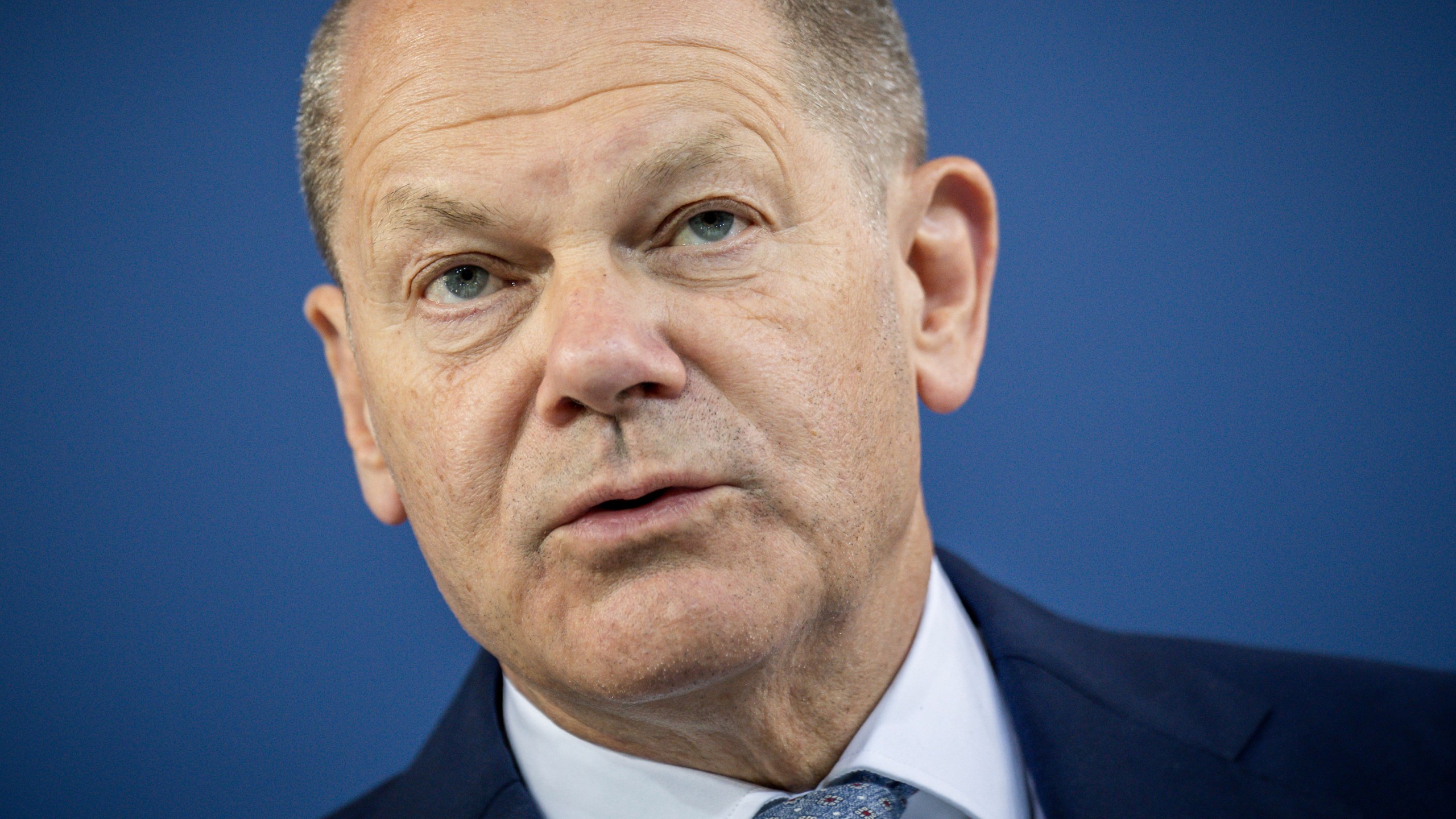 Chancellor Olaf Scholz attends the press conference after the Conference of Minister Presidents in Berlin, Thursday June 2, 2022. (Michael Kappeler/dpa via AP)