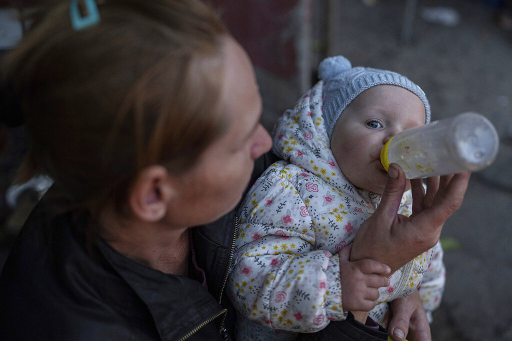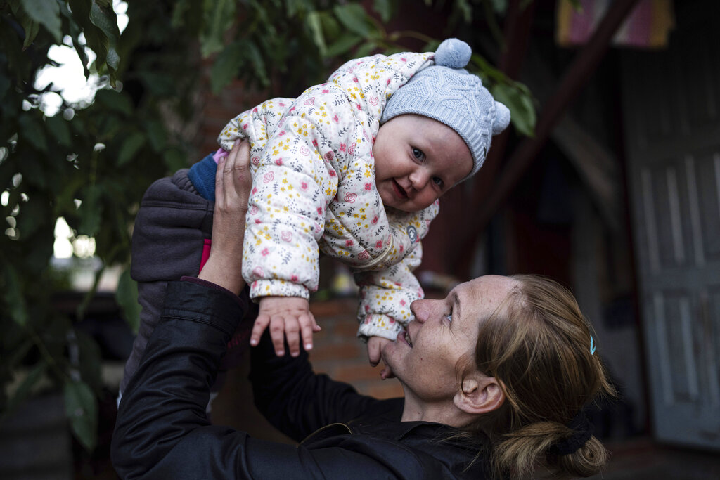 Margaryta Tkachenko, 29 years old, plays with her 9-month-old daughter Sophia in the recently retaken town of Izium, Ukraine, Sunday, Sept. 25, 2022. (AP Photo/Evgeniy Maloletka)